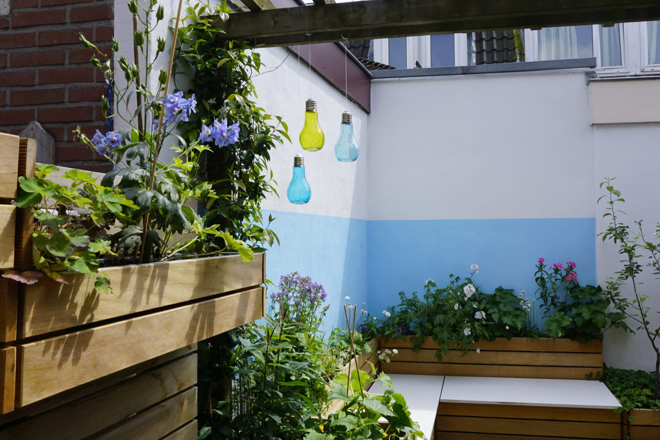 Een kleine tuin in Utrecht in een oude arbeiderswijk. De tuin was smal, lang en donker en daardoor onaangenaam om te gebruiken. We hebben gezocht naar de beste plek om te zitten in de avondzon. Het op maat gemaakte meubel van hardhout met geïntegreerde opslagruimte en plantenbakken was de ideale oplossing. De pergola’s zijn hergebruikt en geplaatst op logische plekken, zodat er visueel bredere ruimtes ontstonden. De bestrating is hergebruikt en aangevuld met tweedehands klinkers. Door een beperkt aantal materialen te gebruiken is er een eenheid gecreëerd.
